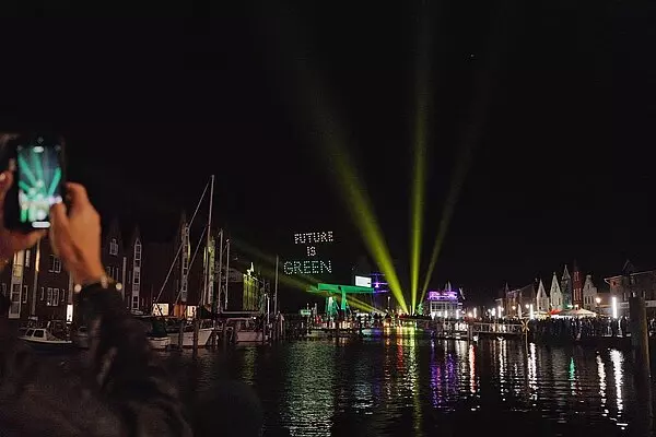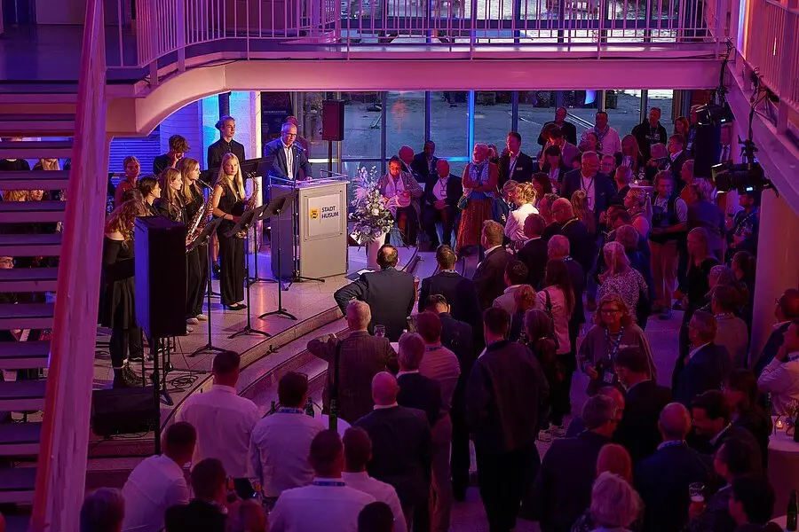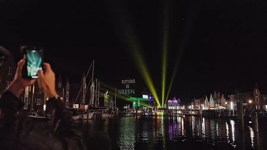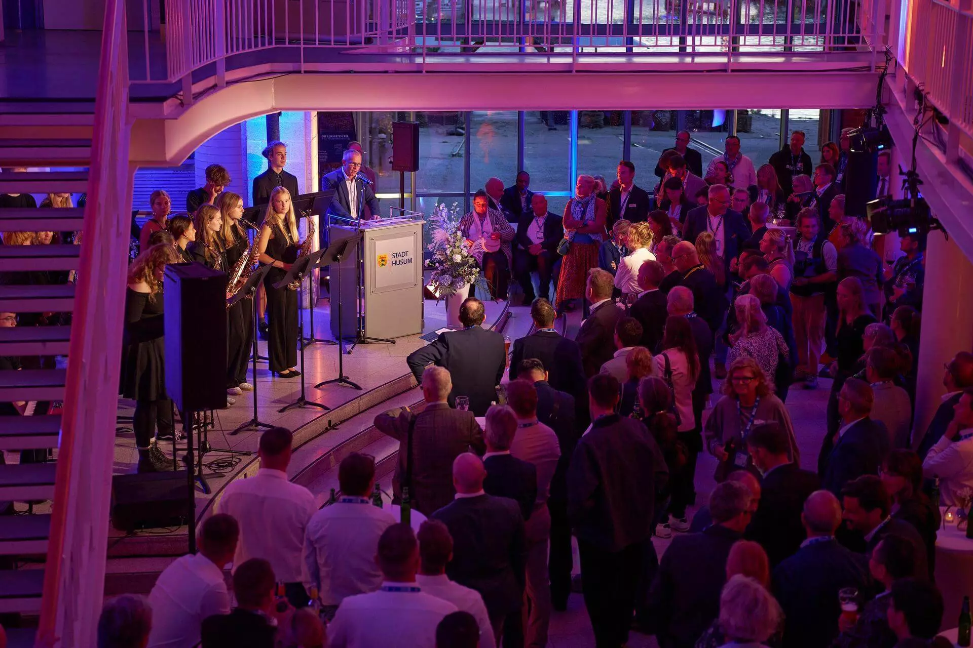 Ein tolles Programm gab es auch außerhalb der Messehallen. Zum Auftakt der HUSUM WIND fanden sich 300 Gäste aus der Erneuerbaren-Branche, Politik und Wirtschaft beim traditionellen Empfang im Rathaus ein. Ein Highlight war die beeindruckende Drohnen-Lichtshow über dem Hafen.
