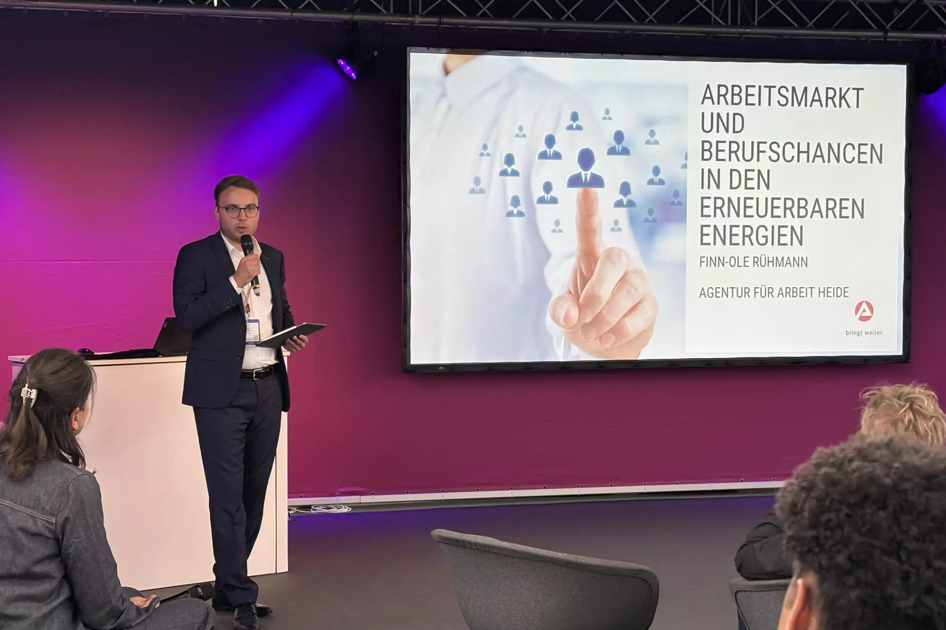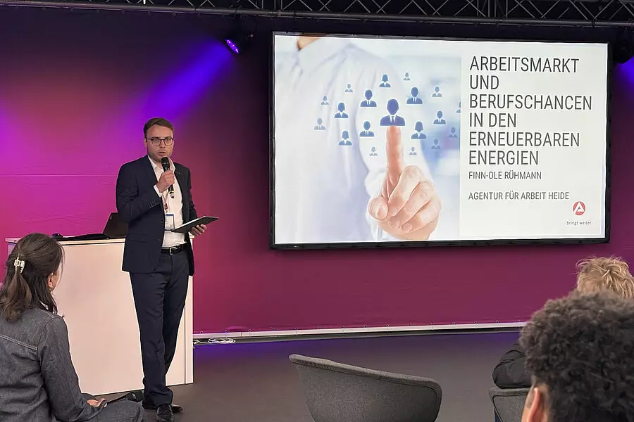 Finn-Ole Rühmann, Arbeitsagentur Heide, sprach dazu über den Arbeitsmarkt und Berufschancen in den Erneuerbaren Energien. Finn-Ole Rühmann: „Die Energiewende schafft Arbeitsplätze. Der Anteil an allen Jobs erhöht sich beständig. Der Fachkräftemangel könnte die Energiewende jedoch ausbremsen.“