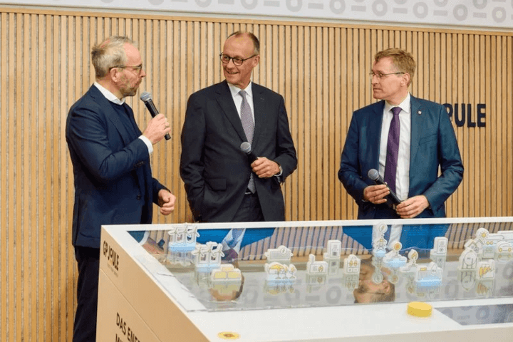 Am Hauptsitz des Erneuerbare-Energien-Unternehmens ließen sich Friedrich Merz, Daniel Günther und seine beiden Landesminister zeigen, dass eine unabhängige, regenerative und preiswerte Energieversorgung in Industrie, Haushalten und Verkehr schon heute möglich ist. Beweisen tun dies zahlreiche von GP JOULE erfolgreich umgesetzte Energieprojekte: Als wichtiger Partner der Energieküste ist GP JOULE in allen Bereichen der Energie-Wertschöpfungskette aktiv, berät Unternehmen und Kommunen, projektiert und baut Wind- und Solarparks, Wärmenetze, Ladeinfrastruktur und Wasserstoffproduktionsstätten – und kümmert sich auch um den sicheren und wirtschaftlichen Betrieb all dieser Anlagen.