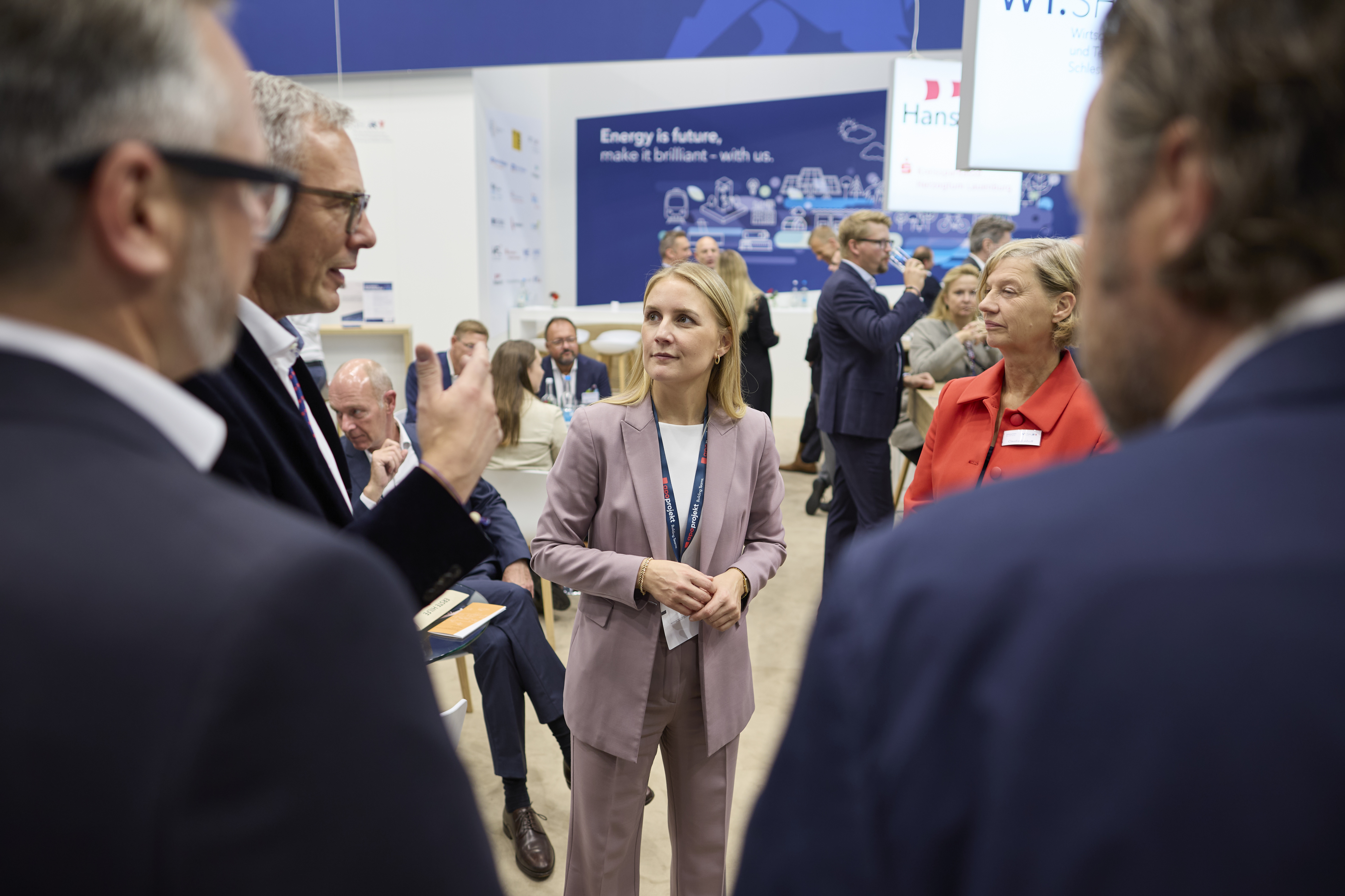 Angeregte Gespräche am Schleswig-Holstein Stand: Joschka Knuth, Staatssekretär MEKUN (links), Dr. Tom Schelo, Copenhagen Infrastructure Partners (Mitte)