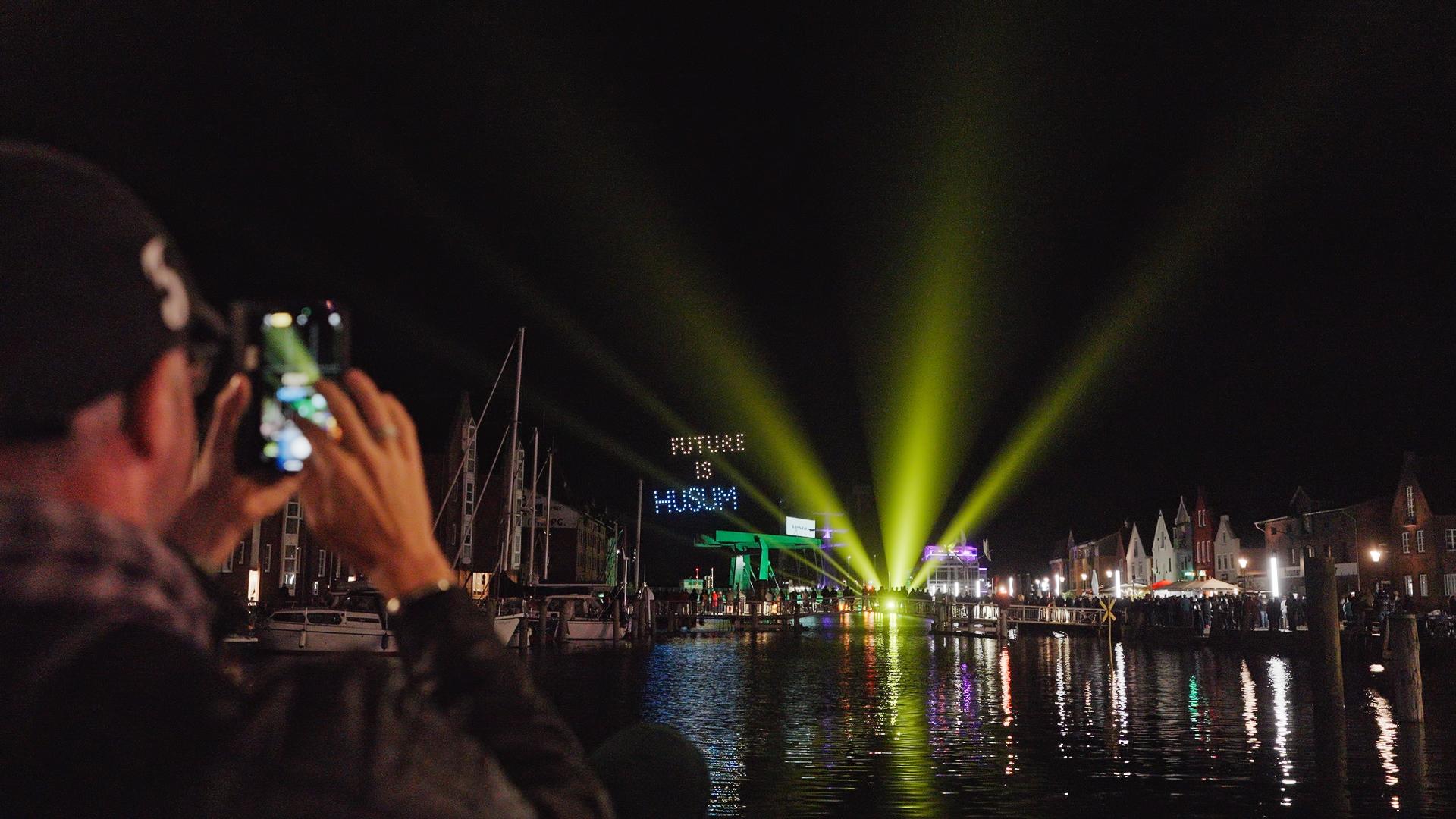 Zur Eröffnung des Messe: beeindruckende Drohnen-Lichtshow über dem Hafen.