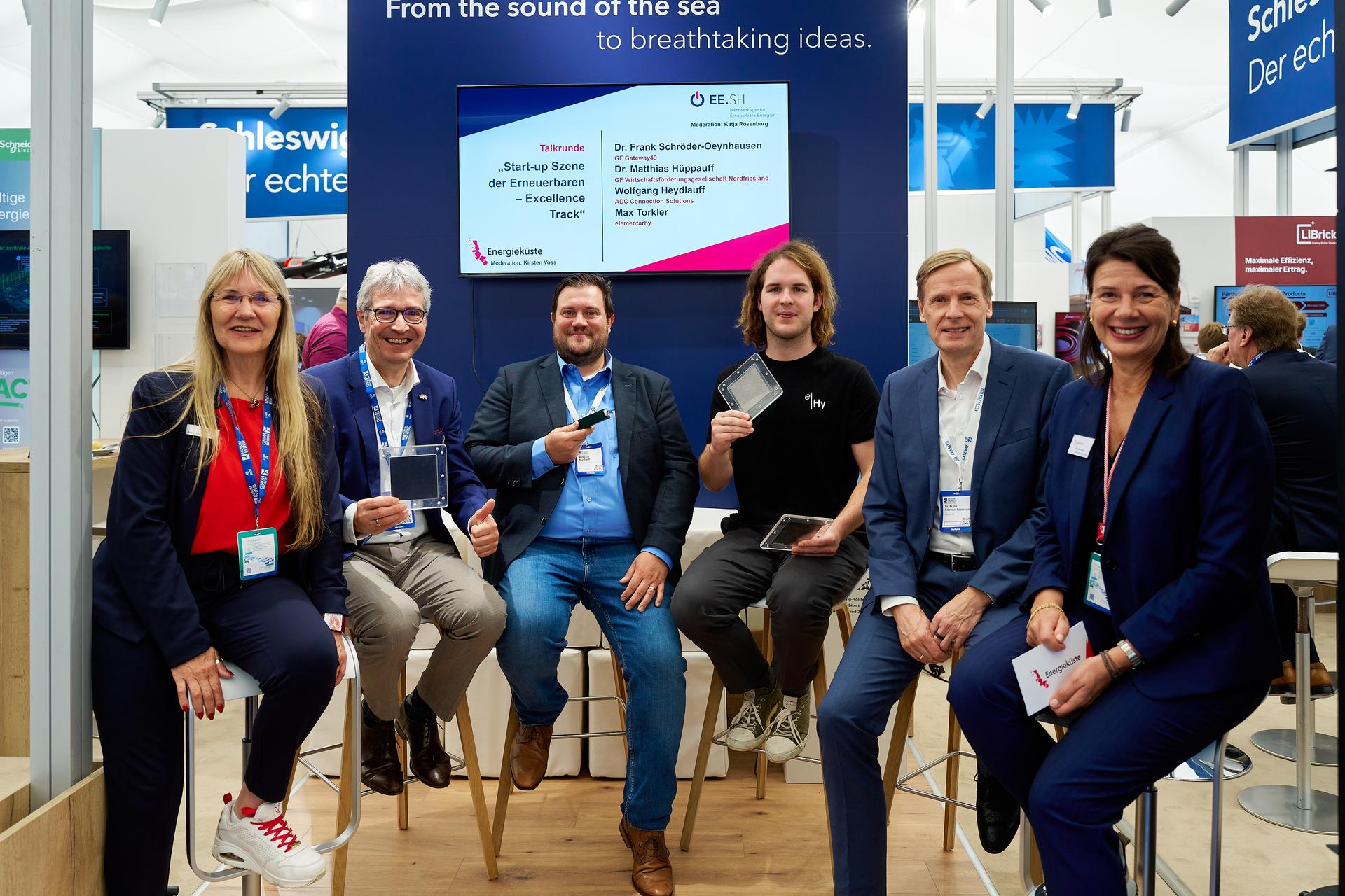 Zum Kampagnen-Start ready.charged.career: v.r.n.l. Dr. Hinrich Habeck, Geschäftsführer der WT.SH, Kirsten Voss, Projektleiterin der Energieküste, Melissa Hanft, Auszubildene GP JOULE, Joschka Knuth, Staatssekretär im MEKUN Schleswig-Holstein, Heino Bubach-Bernhardt, Wirtschaftsagentur Neumünster, Jördis Flatterich, Werkstudentin Energieküste.